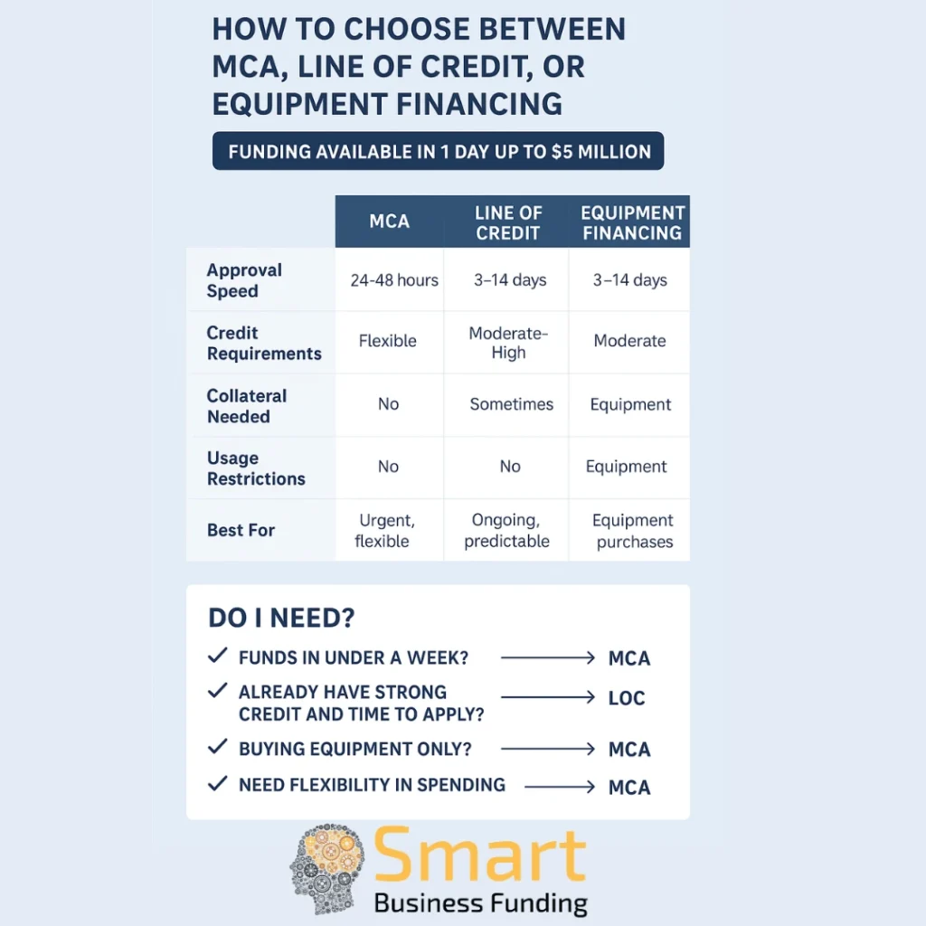 This MCA vs LOC vs equipment financing comparison makes one thing clear: If speed and flexibility are top priorities, MCA comes out ahead.