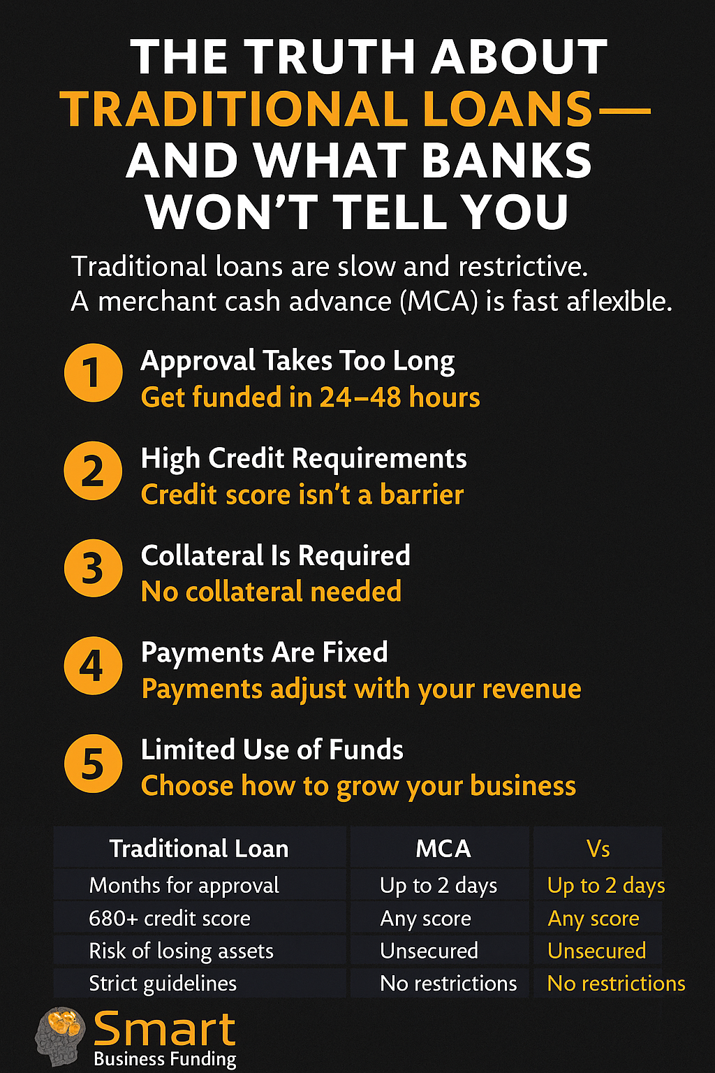 | Feature | Traditional Loan | MCA (Smart Business Funding) |